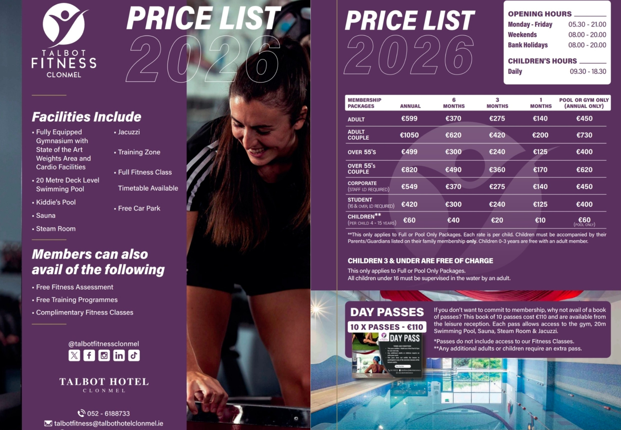 If you have any queries please contact us Tel: 052 6188733 or Email: talbotfitness@talbothotelclonmel.ie